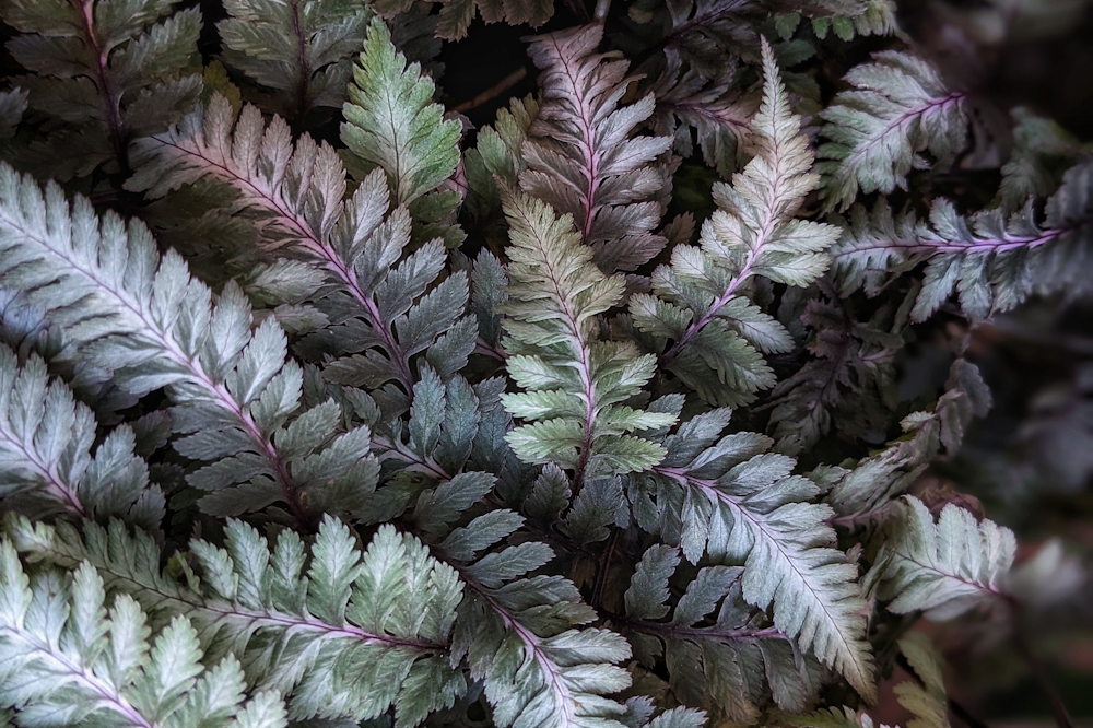- Japanese Painted Fern (Athyrium niponicum): This striking fern features metallic silver-gray fronds with delicate purple accents, adding a touch of sophistication to shaded areas.