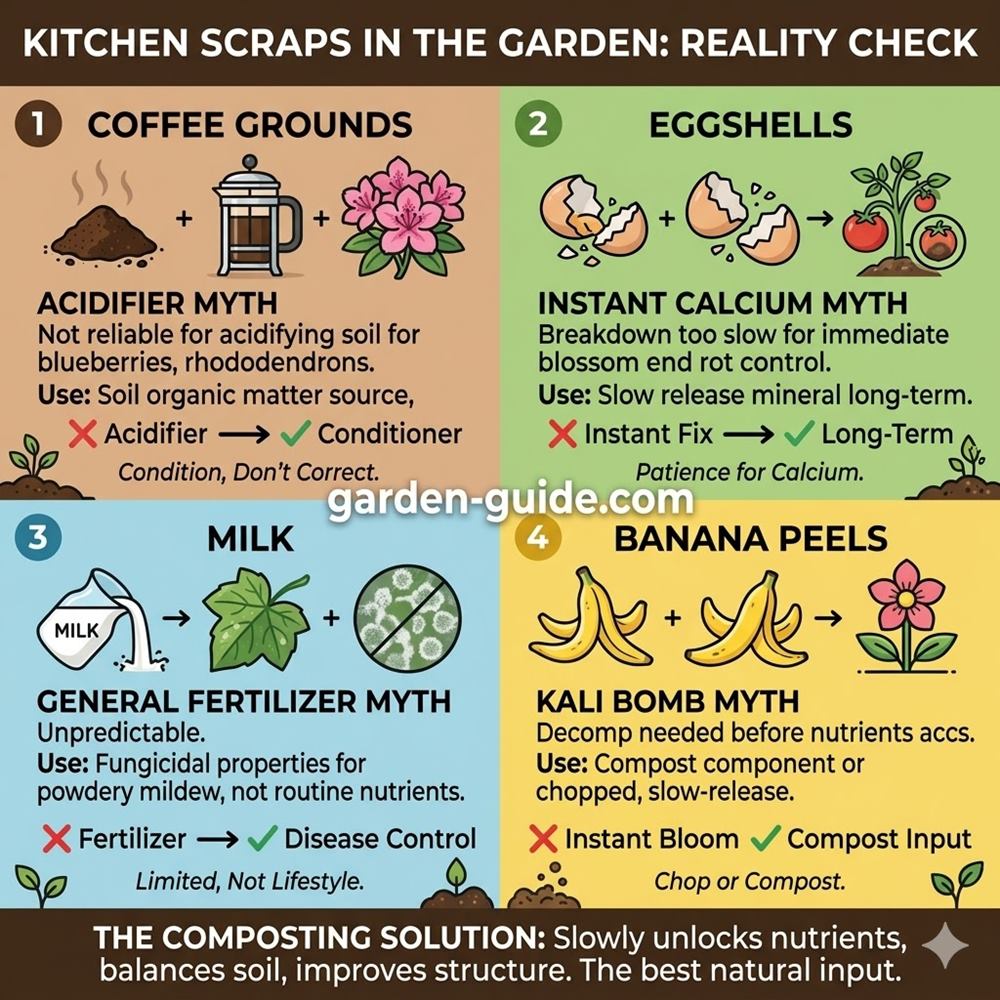 There comes a point in gardening when a person is no longer just sowing seeds, planting things, pruning tomatoes, and fighting slugs, but also starts eyeing kitchen scraps with suspicion. Coffee grounds begin to look like potential soil improvers, eggshells like calcium bombs, banana peels like potassium-powered miracle weapons, and milk like some secret foliar tonic inherited from a grandmother who was apparently both wise and slightly mysterious. And then come the internet graphics, confidently declaring which household leftover is the perfect natural fertilizer for which plant.