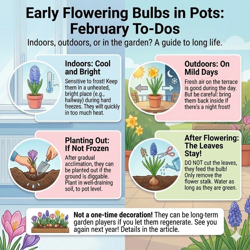 Most potted bulbs sold in February are forced plants. This means they were grown under controlled conditions to “fast-forward” spring and make them bloom in mid-winter. Because of this, they are more sensitive to sudden cold. During hard frosts, keep them in a bright but cool indoor spot, such as an unheated hallway or a well-lit stairwell. A warm living room is not ideal, as higher temperatures will shorten their flowering period.