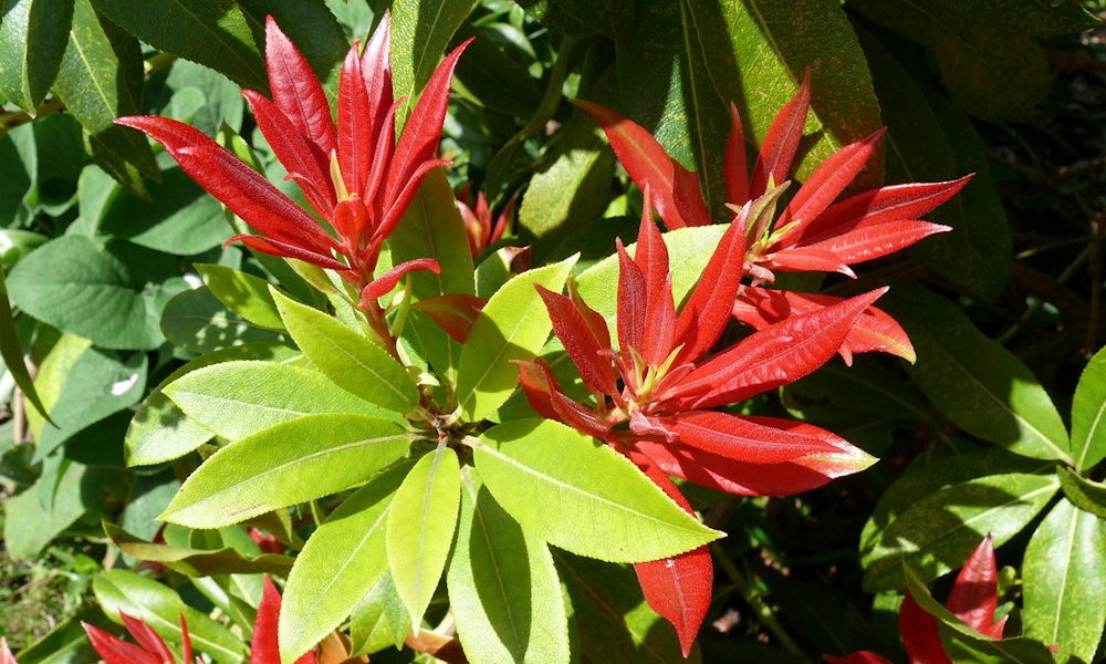 Some shrubs quietly blend into the background. Japanese andromeda does not. In spring, its fresh new growth often emerges in vivid shades of red, creating the impression that part of the garden has briefly caught fire – a harmless and highly decorative illusion that varies by cultivar.