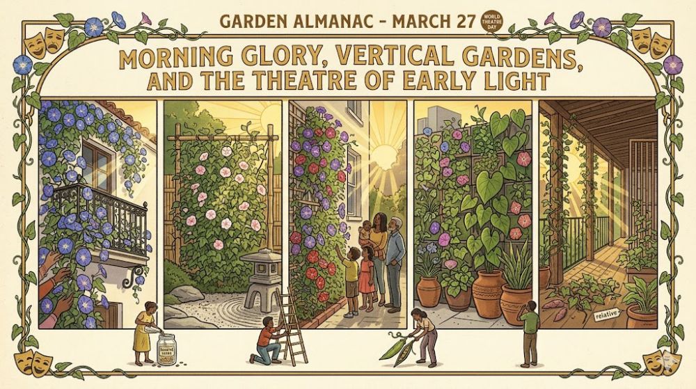 In the Garden Almanac, March 27 becomes a day for climbing beauty, morning attention, and the art of giving a plant something to rise on. It is about surfaces made softer by leaves, about flowers that reward early light, and about the quiet drama of gardens that change from bare frameworks into living architecture.