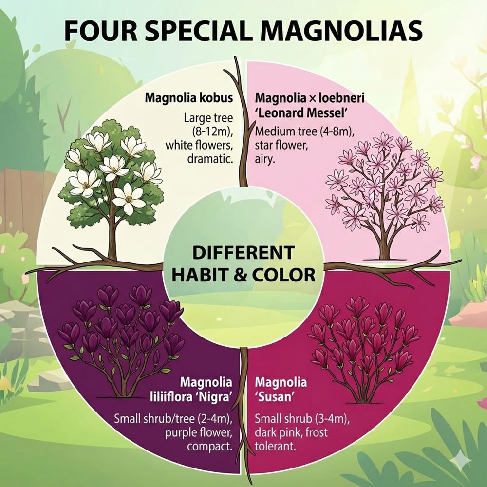 One final design note: magnolias shine brightest against calm backdrops — a clipped hedge, a dark evergreen screen, or simply open sky. Give them visual breathing room and they will reward you.