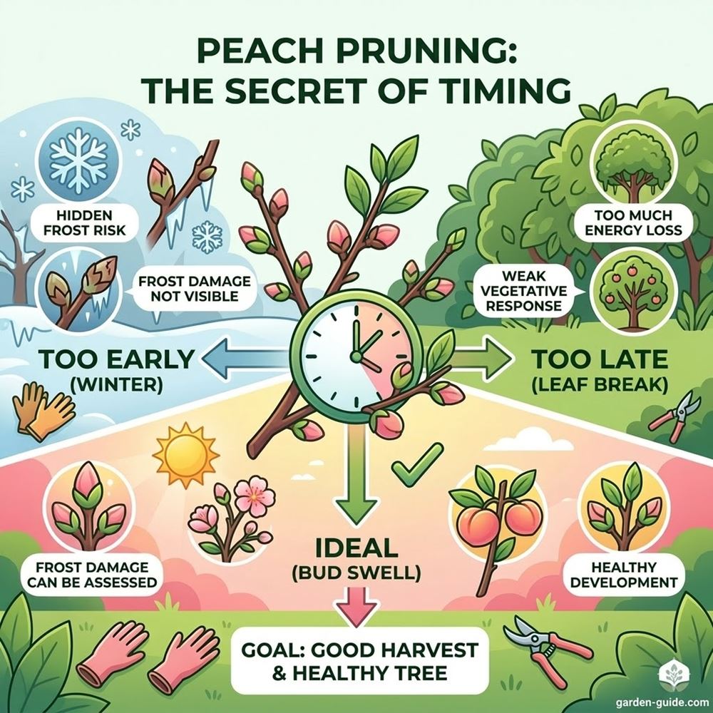 Frost risk plays a major role in peach pruning strategy. Heavy early pruning reduces the number of retained buds before it is clear how many survived winter. In frost-prone gardens, waiting longer allows a more informed balance between fruit potential and structural pruning.