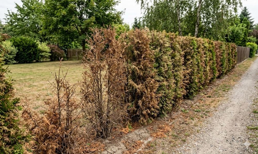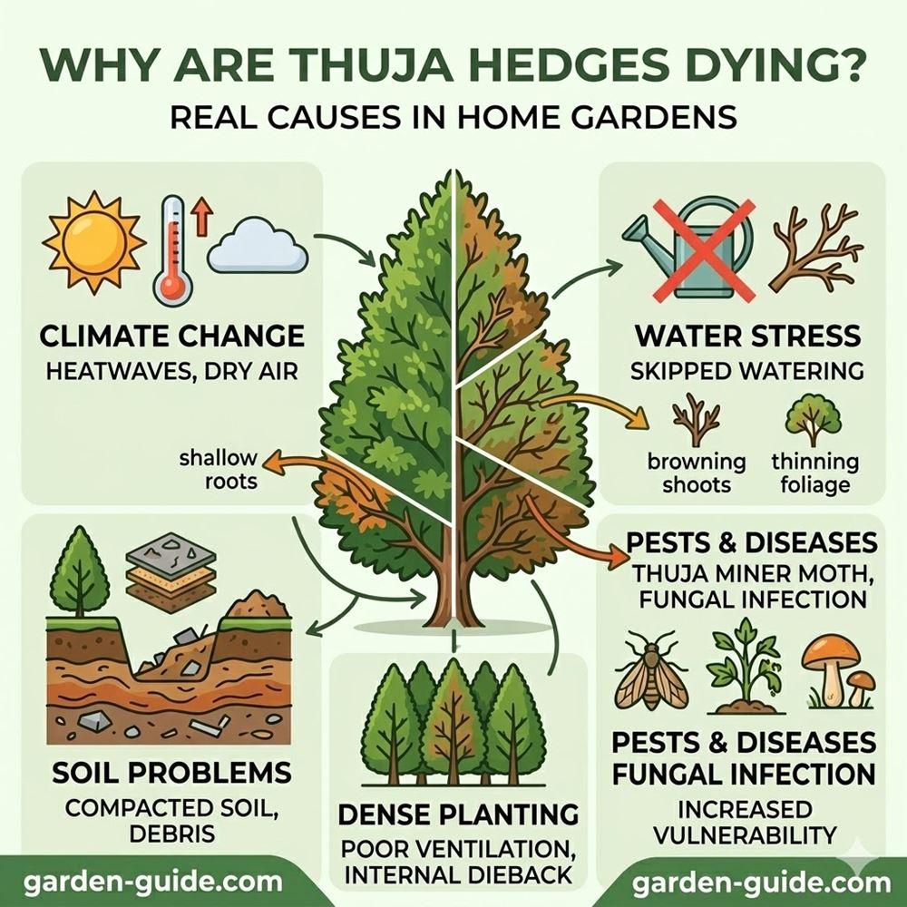 Across Central Europe many once‑healthy thuja hedges are turning brown or dying completely. What used to be a dense evergreen screen is increasingly replaced by thinning branches and dry patches. This widespread decline rarely has a single cause. In most gardens, thuja problems result from a combination of environmental stress, water shortage, soil conditions, and secondary pests or diseases.